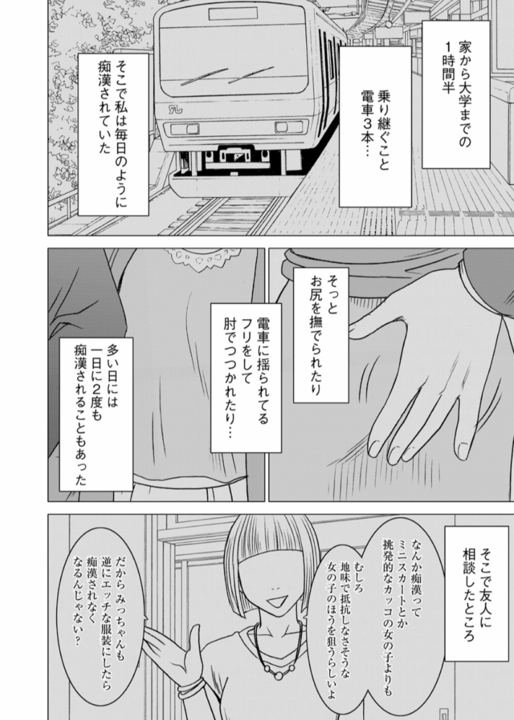 電車で通学する女子大生・黒羽みつは毎日のように痴漢に遭っていた。