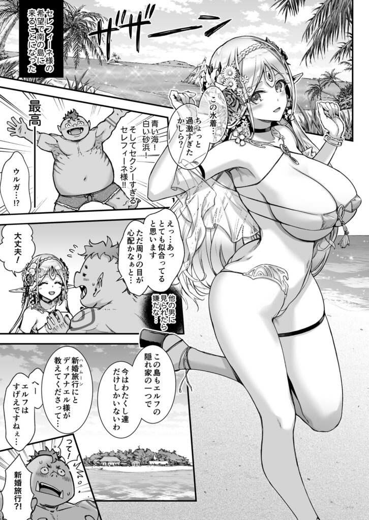 巨乳エルフ・セレフィーネと、純朴なオークの青年・ウルガのラブラブ異種和姦えっちを描いた『淫らなエルフさんはオークくんがお好き』シリーズ2作、