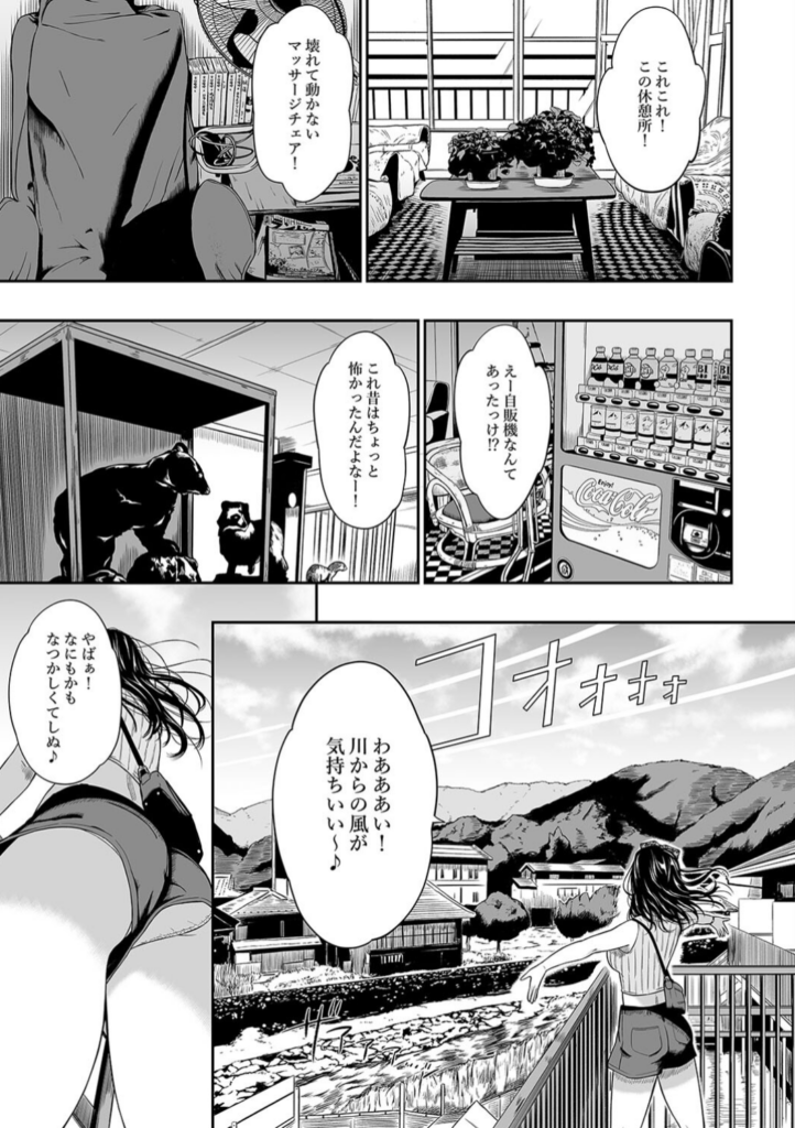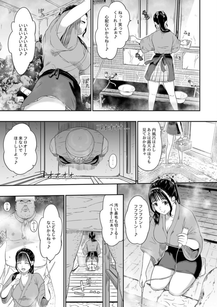 ある日、宿泊客のために一人で離れた場所男にある露天風呂の準備をしているところ、マサモリの影が背後に迫り…